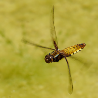 Spannend wird’s bei der Betrachtung des Lebenszyklus. Die Libelle entwickelt sich im Wasser vom Ei zur Larve. Nach mehreren Häutungen klettert sie aus dem Wasser, schlüpft aus der Haut und heben nach kurzer Zeit zum Flug ab. Die Entwicklung im Wasser kann je nach Art Jahre dauern. Maximal 3 bis 4 Monate währt die Flugzeit. In dieser Zeitspanne erfolgen die Fortpflanzung und Verbreitung. Jetzt sind sie dank ihren Flugkünsten erfolgreiche Jäger. Sie beherrschen alles in der Luft: vorwärts-, rückwärts-, auf- und abfliegen mit Drehungen und Wendungen. Eine Libelle kann eine Mücke aus einem Schwarm heraus fokussieren und diese dann zielgenau ansteuern und erbeuten. Die Ausprägung ihres Augenapparats ermöglicht diese unglaubliche Leistung!